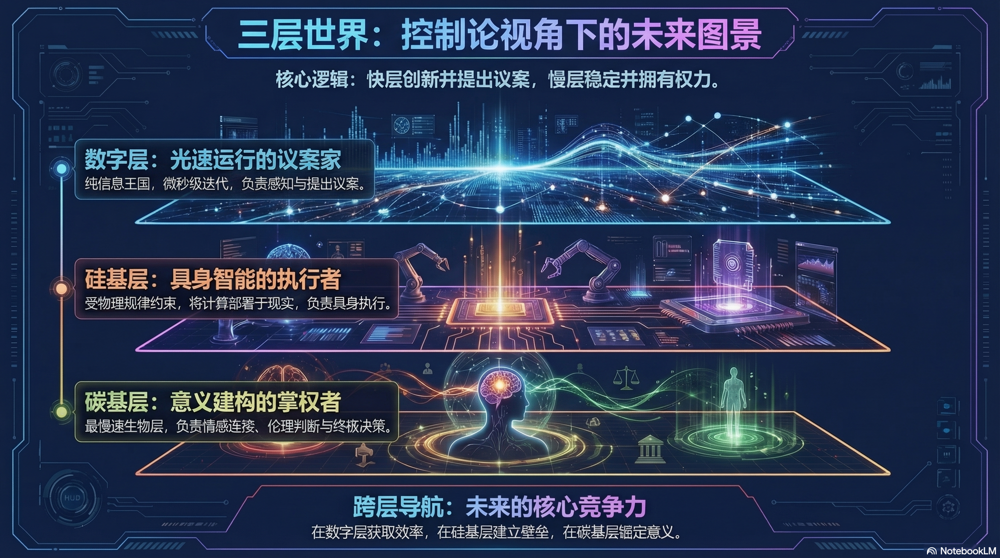 我的核心假设是:世界正在沿着反馈速度撕裂成三层,这个分裂不是暂时的扰动,而是物理定律作用下的结构性演化。更精确地说,数字层和碳基层已经是两个近乎解耦的子系统,它们不需要、也不可能以相同的速度运行;硅基层是它们之间的边界层,正处于历史上最剧烈的过渡动态中;而连接它们的接口,是当前最值得关注的权力战场。